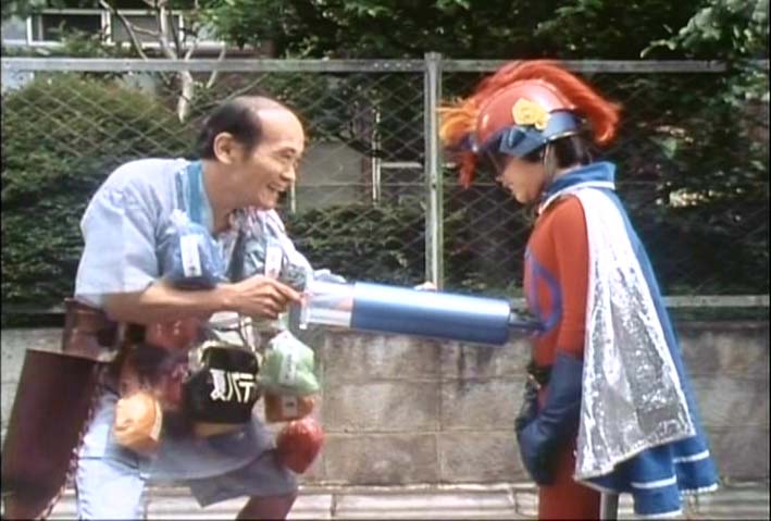 画像は、怪人「夏ばて」に体力を吸い取られるネモトマン。「まだ思い出しまへんか。お礼やいうてあないにジュース飲んだら、夏ばてするのも当然だす」。テキヤのインチキオヤジっぽさがリアル過ぎるこの怪人夏ばては、ダンプ松本やアントニオ猪木などの体力エキスと一緒にネモトマンの体力をも公園で売っていて、「ヘイひと吸い千円だす。精がでまっせ」と商売しているのだ。