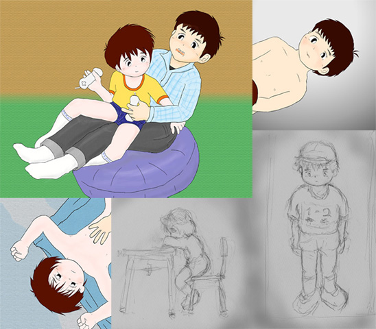 右下も駿君の回想。「子ども部屋」をお読みいただいた方にはおわかりでしょう。小一の駿君も描いてみたんですがゴツすぎるかな(笑)