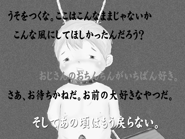 と言って、おじさんはぼくの手首と足首にも、首輪の細くて小さいみたいなのをまいて止めた。それだけでぼくははずかしくなったけど、何だかドキドキもした。今は別にいたくない。ただこれまでのことだって人には言えないし見せられないことばかりだけど、今のすがたが人に見られたらと思うとすごくはずかしい。