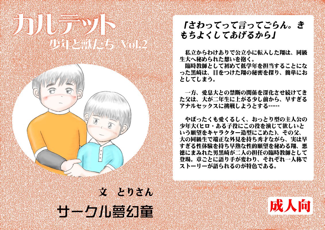 Vol.1の続き。濃度は増していますがまだ少年同士の絡みには至らないという。父子相姦要素もあり。